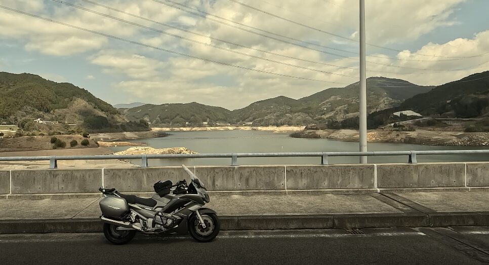 しゃくなげ広場の前でバイクと一緒に写真を撮り、嘉瀬川ダムの上でも一枚。