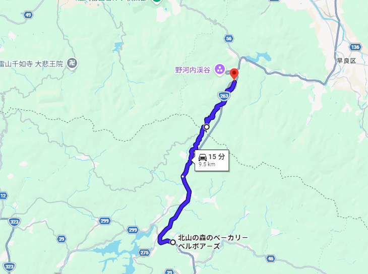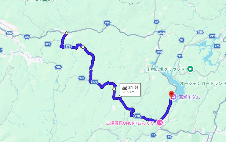 福岡市内 → 日向峠 → 県道49号線(大野城二丈線)→ 西九州自動車道 → 福ふくの里 → 藤川二丈線(白木峠)→ 七山 → 池原古湯線(県道278号線)→ 古湯 → 嘉瀬川ダム → 北山ダム → ベルボアーズ → 三瀬峠(旧道)→ 曲渕ダム → 福岡市内