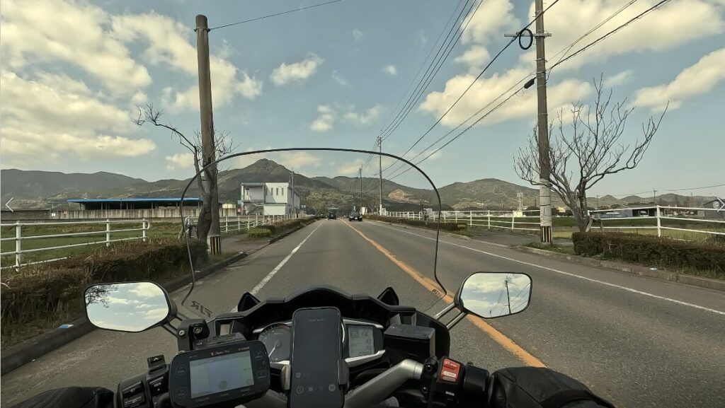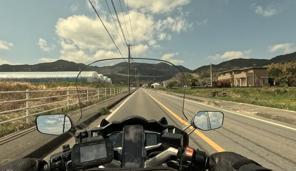 広い糸島平野の中を走り抜けるこのルートは、鋭いカーブこそありませんが、のんびりとしたツーリングには最高の道です。