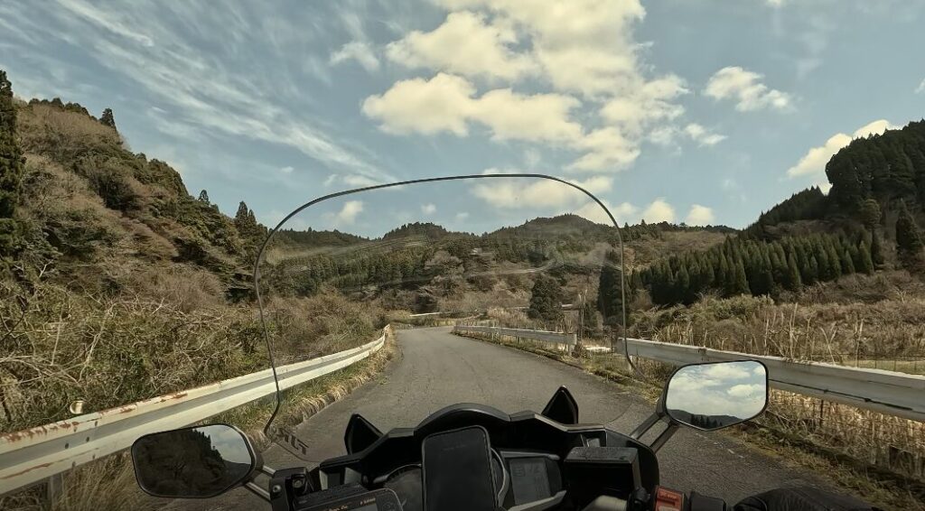西九州自動車道の下をくぐり、少しずつ高度が上がってくると、前方に連なる山々が美しくて、その先にゆるやかなカーブが続くワインディングが現れてきます。