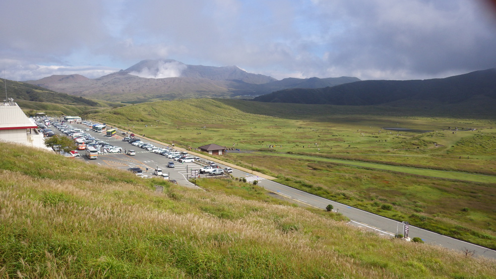 今回は火口を眺める駐車場で記念撮影して、次の目的地である草千里に向かいます。