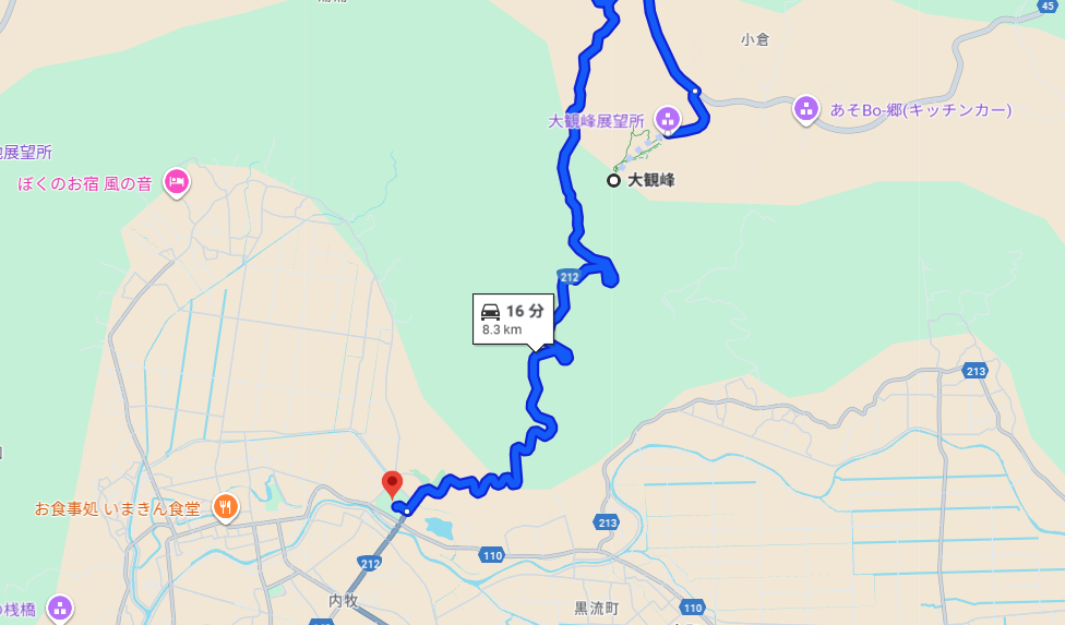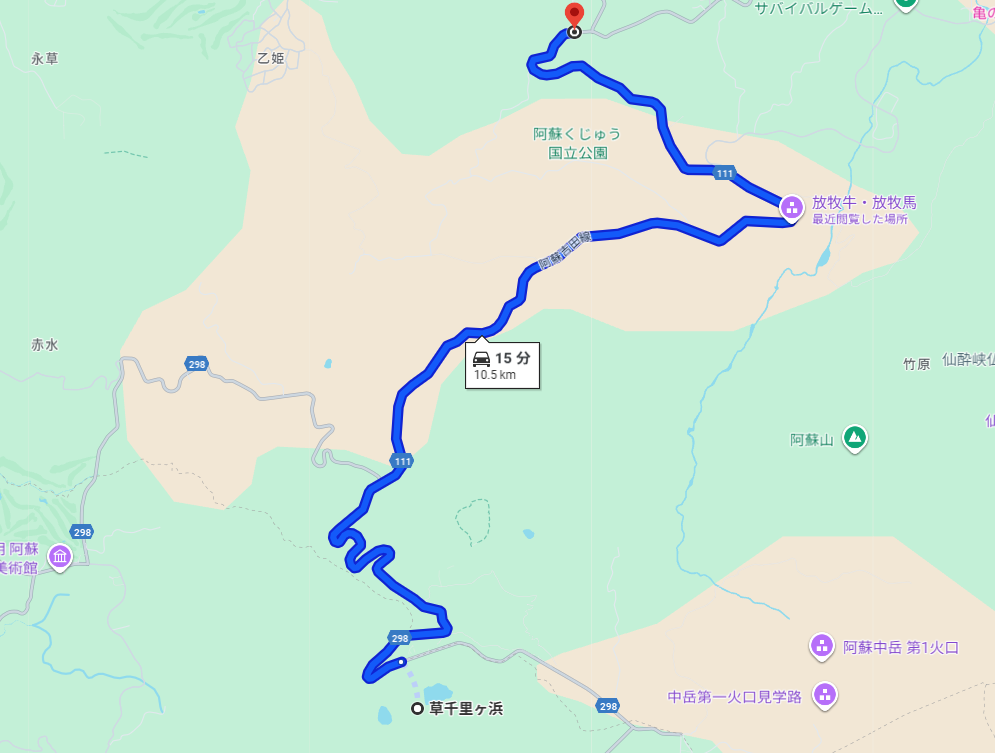 出発地は福岡市内、目的地は阿蘇・草千里を中心とした阿蘇地方。