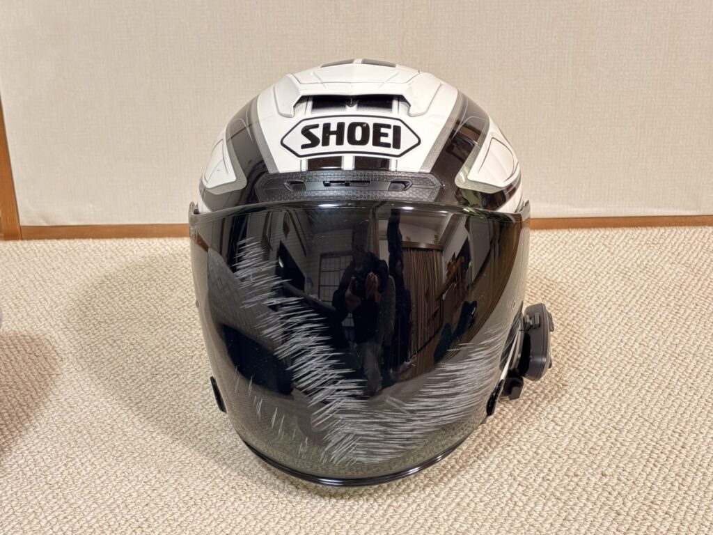 しかし、最も痛々しかったのは、ヘルメットのシールドについた傷です。