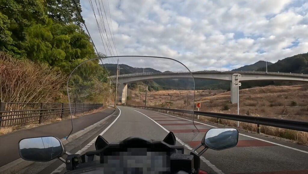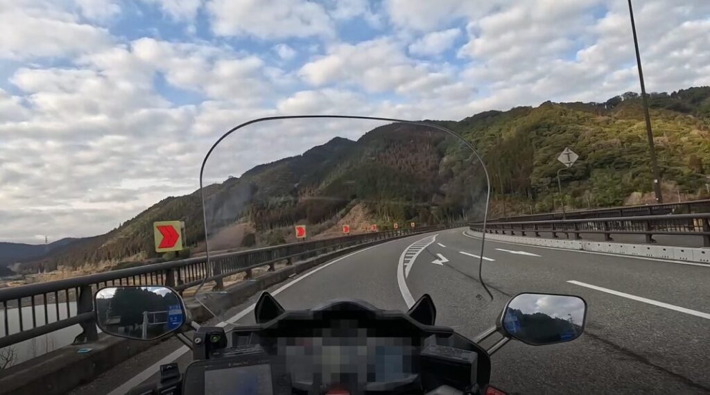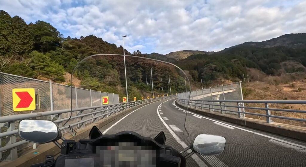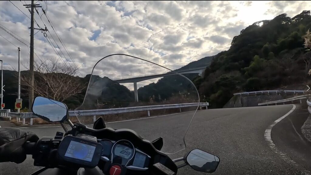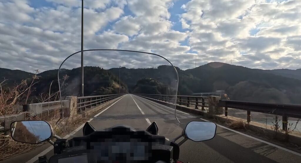 このスパッと伸びた橋上の走りが爽快で、FJRのエンジン音が気持ちよく響きます。