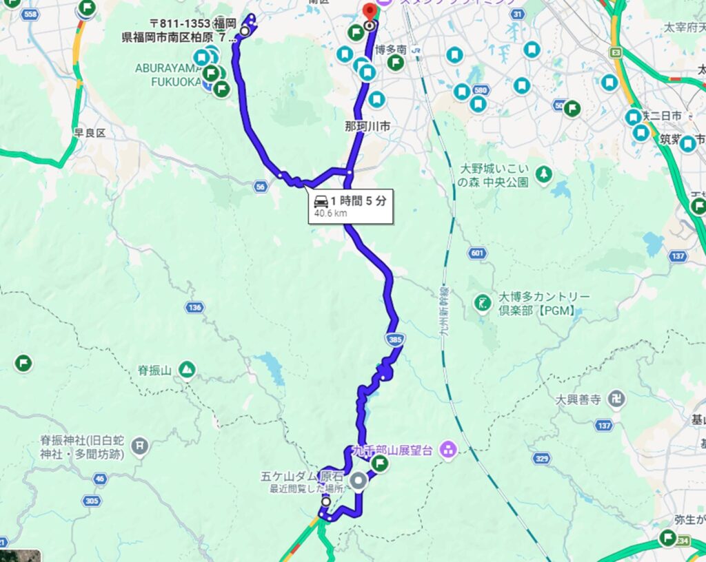 今回のコース: 福岡市内 ⇄ 五ケ山ダム原石山展望所周回